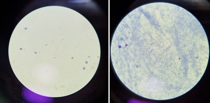 요 침사검사에서도 혈구로 추정되는 세포들이 관찰되었습니다.