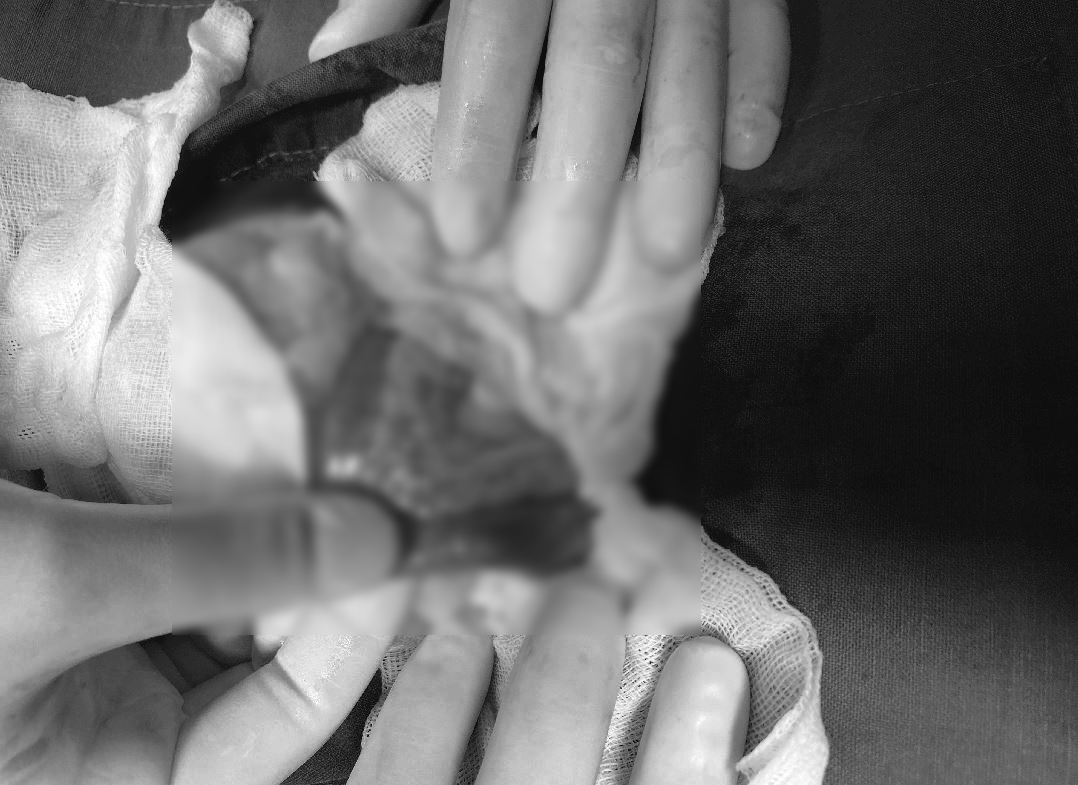 코숏 아이의 실제 수술 사진으로 이물이 들어있는 장의 모습이에요.