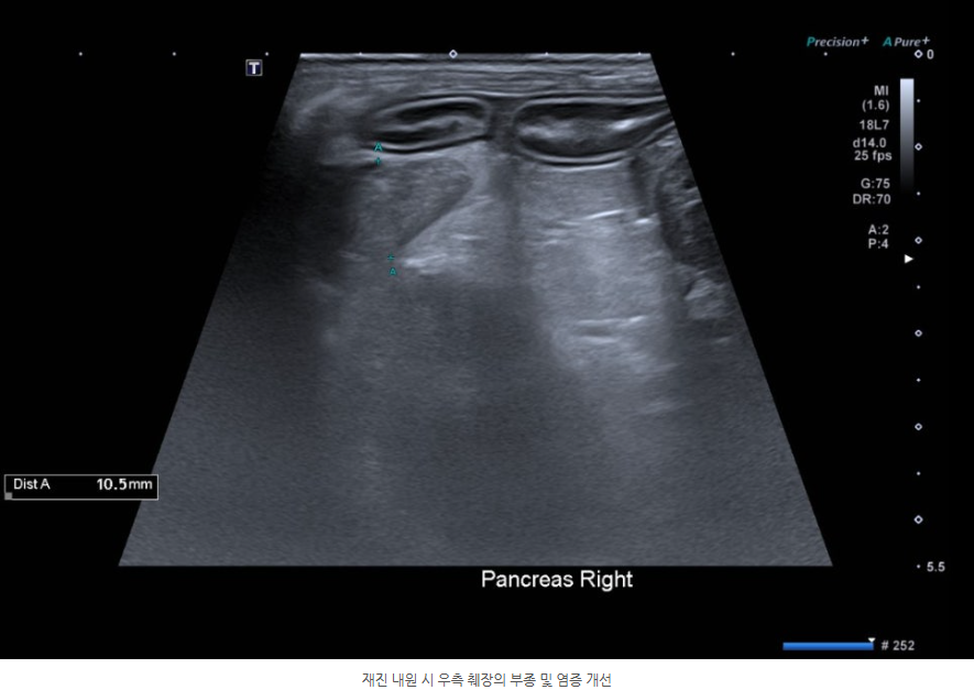 재진 내원 시 대다수의 혈액검사 수치 개선이 확인되었으며 복부초음파상 확인되던 부종성 병변과 염증소견은 현저한 개선을 보였습니다.