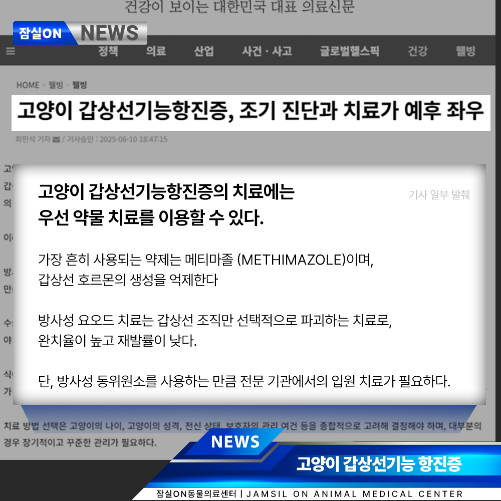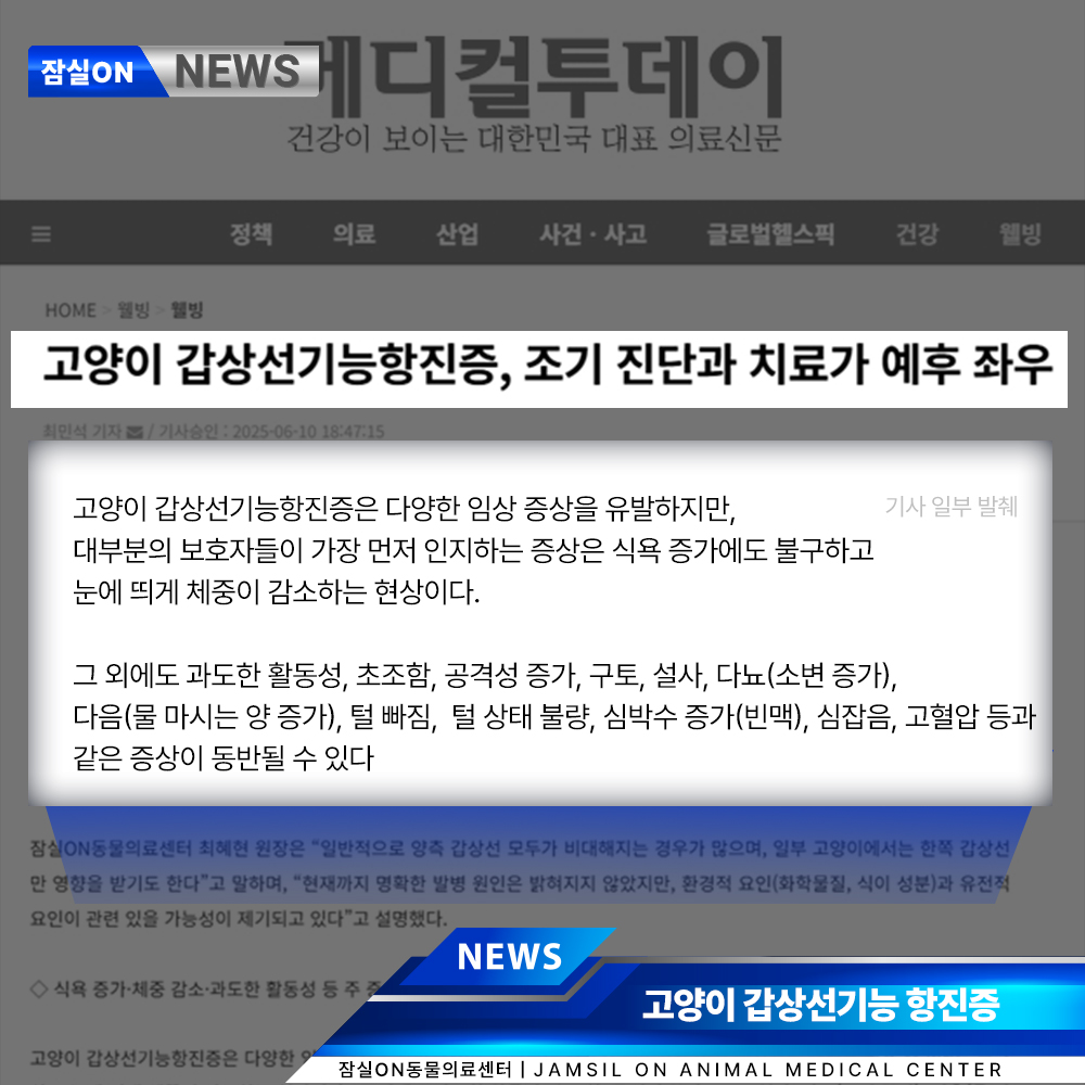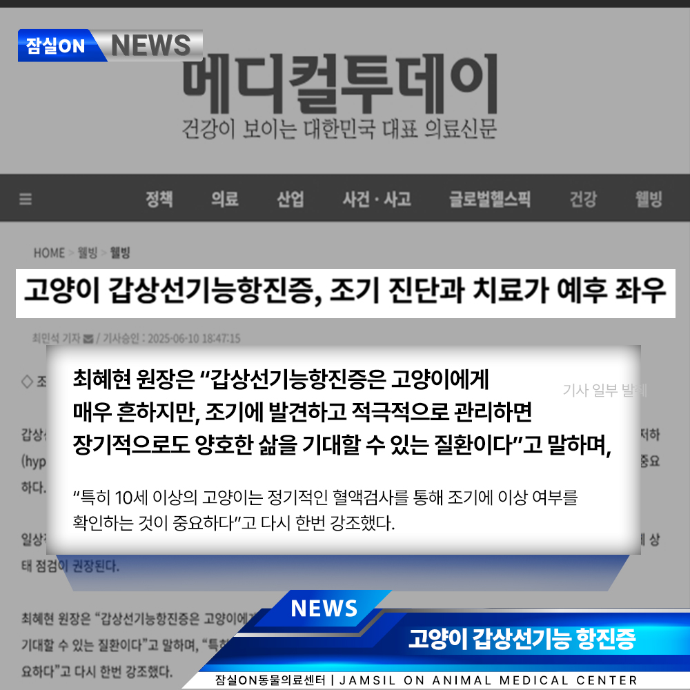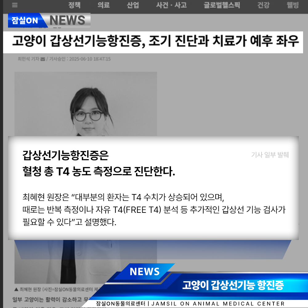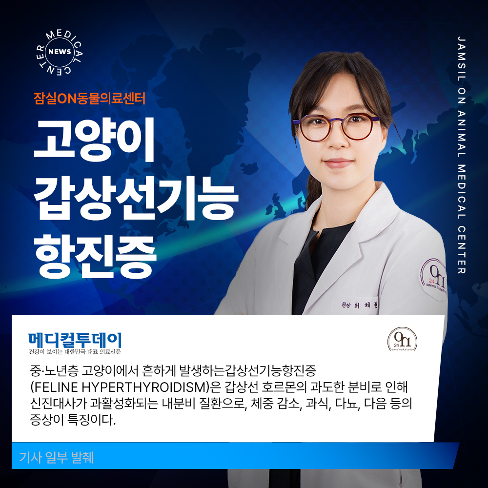 [최혜현 대표 원장] 조기 진단과 치료가 중요한 '고양이 갑상선기능항진증' 등록일2025.09.11 조회수109 안녕하세요 여러분 :-)잠실ON동물의료센터입니다.최근 메디컬투데이 뉴스에고양이 갑상선기능항진증과 관련된최혜현 원장님 기사가 보도되었습니다.최혜현 원장님 기사 보러 가기https://mdtoday.co.kr/news/view/1065603768907129 이전글 [이주원 원장] 면역이 스스로를 공격하는 '면역매개성 빈혈'(IMT, IMHA) 다음글 [이석우 원장] 정기검진의 중요성을 알리는 '반려동물 림포마' 목록