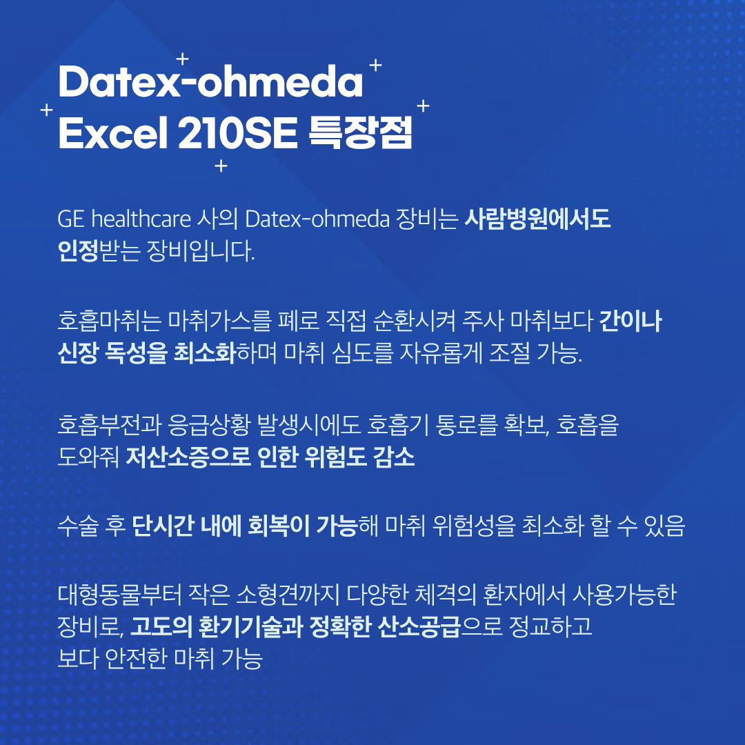 - 대형동물부터 작은 소형견까지 다양한 체격의 환자에서 사용가능한 장비로, 고도의 환기기술과 정확한 산소공급으로 정교하고 보다 안전한 마취 가능