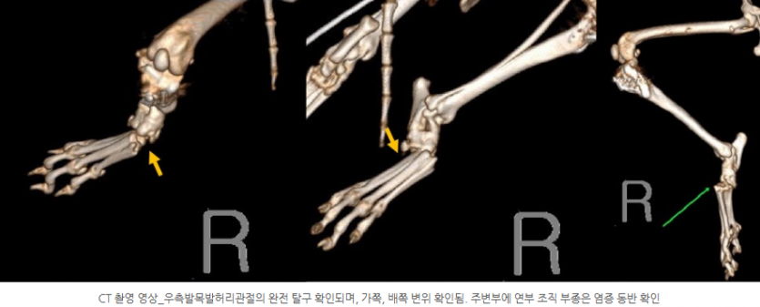 내원 당시에 반달이는 발목 관절이 틀어져있었고, 우측 후지를 완전히 들고 있는 상황이었습니다.